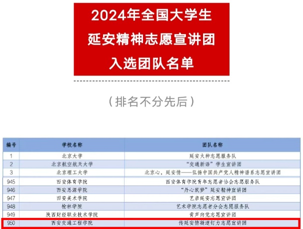 近日,“中国青年志愿者”官方微信公众平台公布《关于遴选2024年全国大学生井冈山精神志愿宣讲团的公告》和《关于遴选2024年全国大学生延安精神志愿宣讲团的公告》入选团队名单,学校机械与电气工程学院“团聚道钉之声”青年宣讲团和“传延安情凝道钉力”志愿宣讲团,两支队伍成功入选。