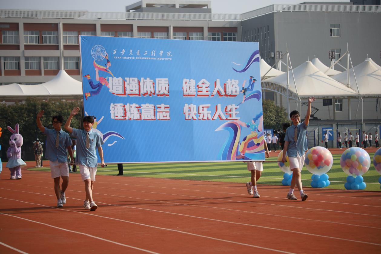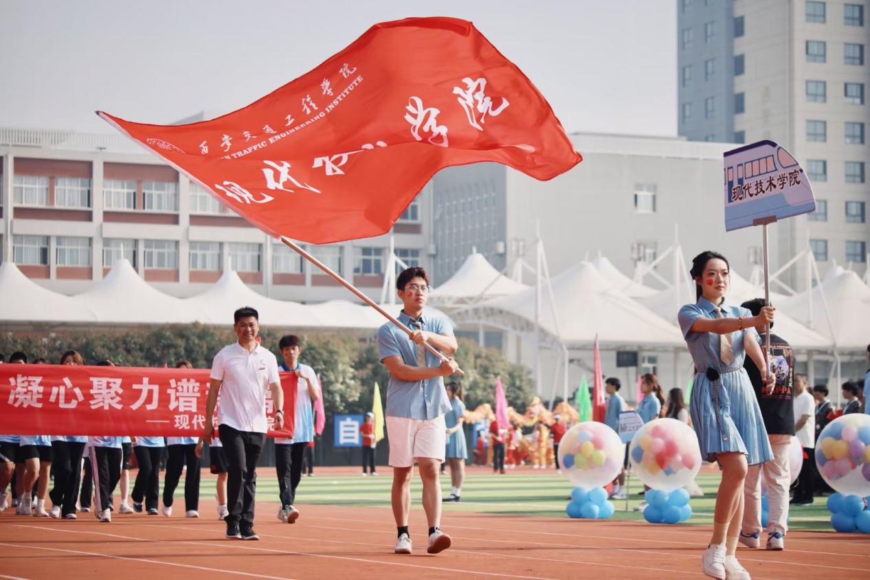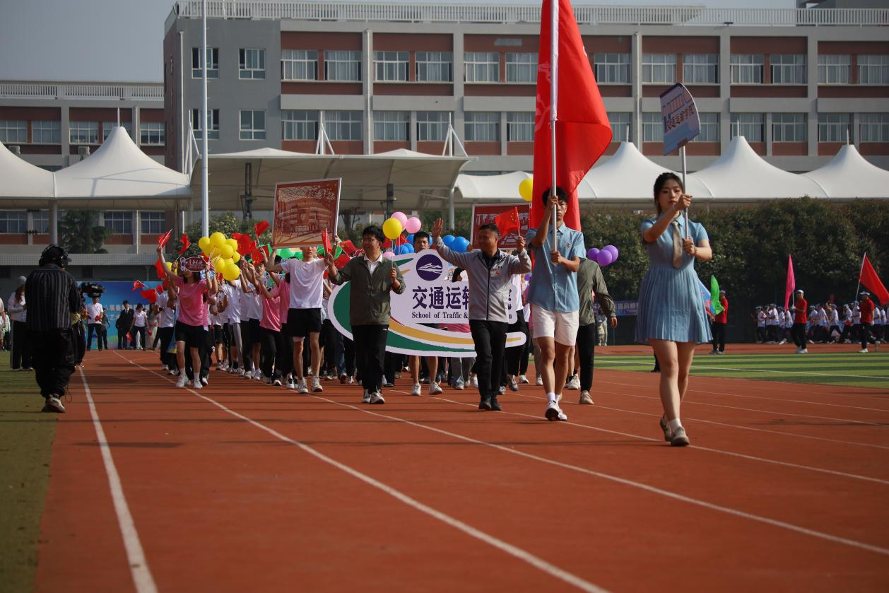 上午八点三十分,伴随着伴着激昂的进行曲,国旗方队、校旗方队、裁判员代表队、运动员代表队、团体操表演方队等19支队伍迈着矫健的步伐,在师生的瞩目下入场:英姿飒爽的旗手、青春亮丽的引导员、可爱俏皮的吉祥物、高大威猛的齐天大圣和大黄蜂机甲,具有交院特色的IP形象--西小交、西小美也在本届运动会亮相。行经主席台,交通运输学院代表队用“绿皮车”到“复兴号”,演绎铁路交通的变迁,展现中国式现代化建设历史的生动缩影;土木工程学院代表队则用中国传统工艺鲁班大师榫卯结构巧妙设计了“盛世中华”的立体结构,用队形和展板展示了中国桥隧建筑的绝世风采;机械与电气工程学院用展板生动展示了我校三迁校址、四更校名艰苦卓绝的发展历史;人文与管理学院代表队用活力四射的舞步,阳光热情地展示了交院学子的青春风采;现代技术学院代表队文儒风雅,一把折扇、一支中国舞将“书生意气,挥斥方遒”展现的淋漓尽致;中兴通信学院代表队用四辆花车栩栩如生地展现了中国四大名著《西游记》《红楼梦》《水浒传》《三国演义》的经典魅力。师生用复古摇曳的音乐和舞步诠释中国通讯技术从1G时代到5G时代的迅猛发展。各代表队别出心裁,无不诉说了对伟大祖国、对西交院真挚浓烈的爱。
