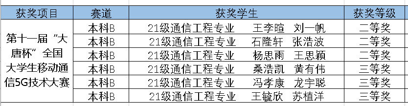 近日,第十一届“大唐杯”全国大学生移动通信5G技术大赛获奖结果出炉,中兴通信学院学生荣获二等奖3项,三等奖3项。自启动比赛工作以来,在学院各级领导给予大力支持下,参赛团队对备赛工作进行了细致的部署,经过充分的赛前辅导和准备,共12名同学荣获奖项,在本次比赛中取得了优异的成绩。