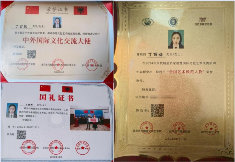 丁丽梅的艺术成就并非一蹴而就。多年来,丁丽梅始终致力于促进中外文化交流,不仅多次在包神铁路集团廉洁文化比赛中获奖,还在“瀚青国韵•翰墨传情杯”全国书画大赛、“踔厉新时代•奋进新征程”全国书画大赛、“国墨杯”全国书画艺术大赛等赛事中屡获殊荣,被授予“中外国际文化交流大使”、“全国艺术模范人物”等称号,其作品《龙耀中华》曾被加纳大使馆收藏,并作为国礼赠予巴基斯坦大使馆。