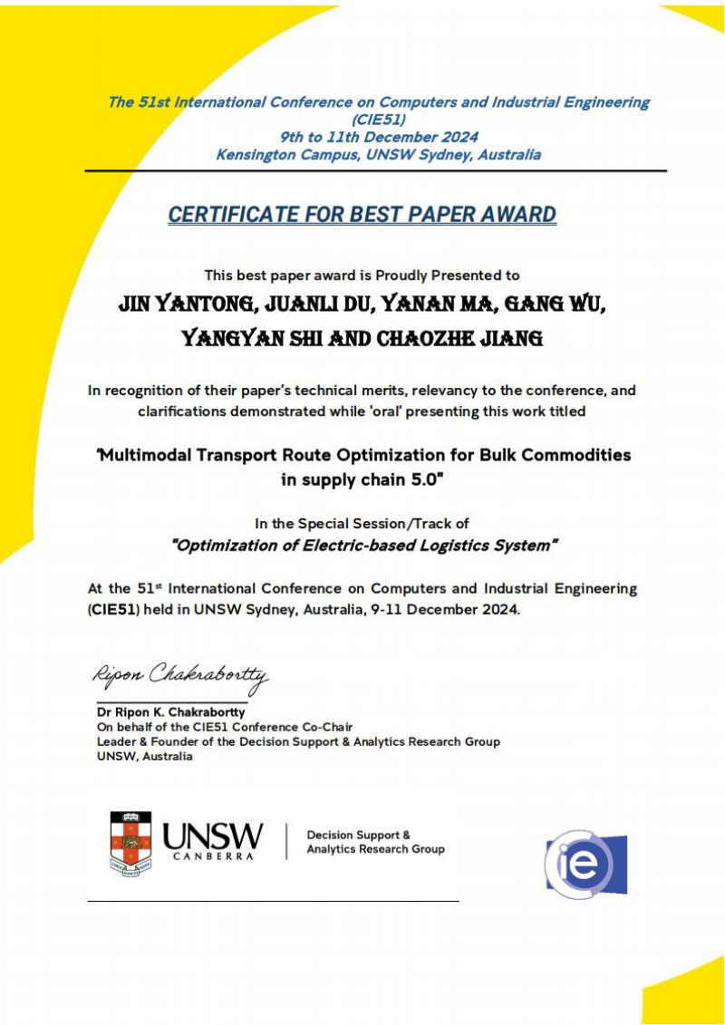 都娟丽所在团队研究不仅展示了供应链多式联运领域的前沿发展,也体现了我校在国际学术交流中的活跃地位。团队的出色表现受到了与会专家的高度评价,并荣获本次大会的最佳论文奖(The Best Paper Award),这标志着团队研究成果获得国际学术界的高度认可。